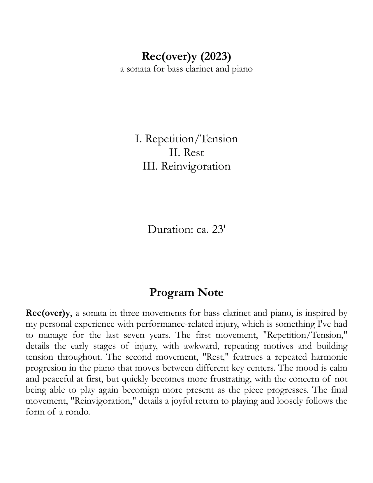 Rec(over)y, a sonata in three movements for bass clarinet and piano, is inspired by my personal experience with performance-related injury, which is something I've had to manage for the last seven years. The first movement, "Repetition/Tension," details the early stages of injury, with awkward, repeating motives and building tension throughout. The second movement, "Rest," featrues a repeated harmonic progresion in the piano that moves between different key centers. The mood is calm and peaceful at first, but quickly becomes more frustrating, with the concern of not being able to play again becomign more present as the piece progresses. The final movement, "Reinvigoration," details a joyful return to playing and loosely follows the form of a rondo.