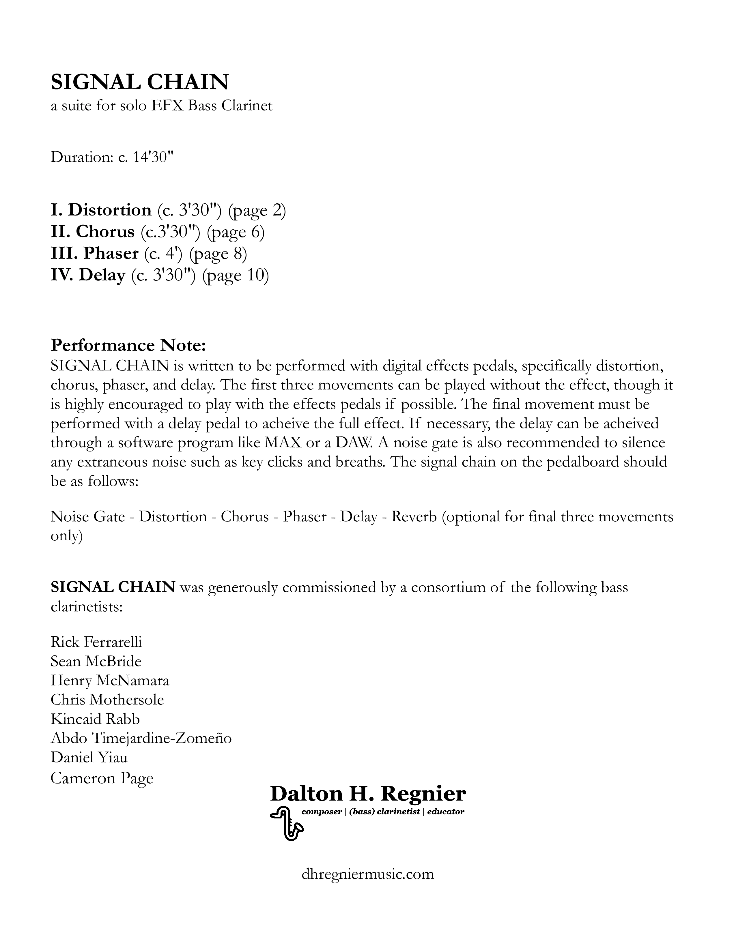 SIGNAL CHAIN is written to be performed with digital effects pedals, specifically distortion, chorus, phaser, and delay. The first three movements can be played without the effect, though it is highly encouraged to play with the effects pedals if possible. The final movement must be performed with a delay pedal to achieve the full effect. If necessary, the delay can be achieved through a software program like MAX or a DAW . A noise gate is also recommended to silence any extraneous noise such as key clicks and breaths. The signal chain on the pedalboard should be as follows: